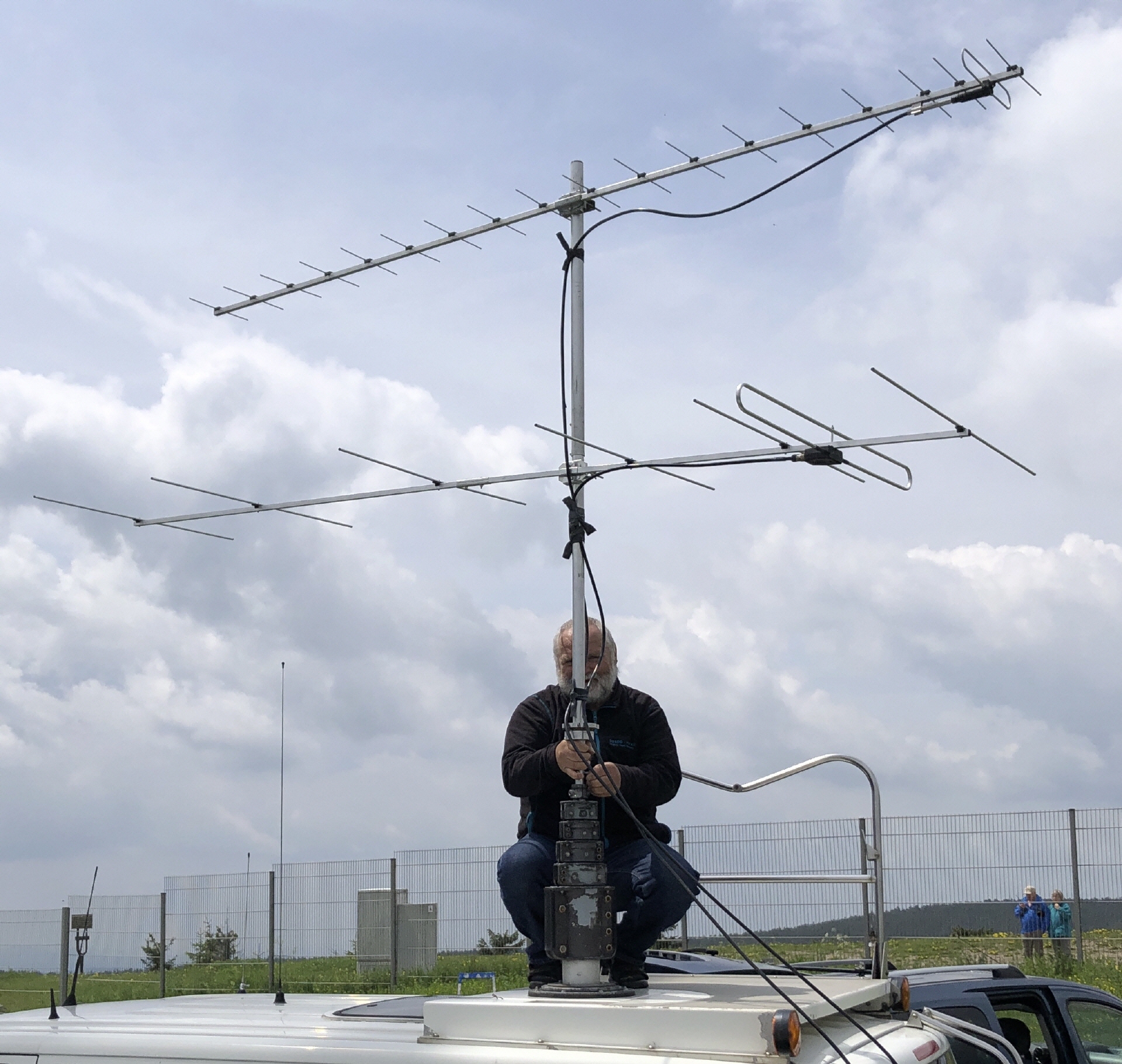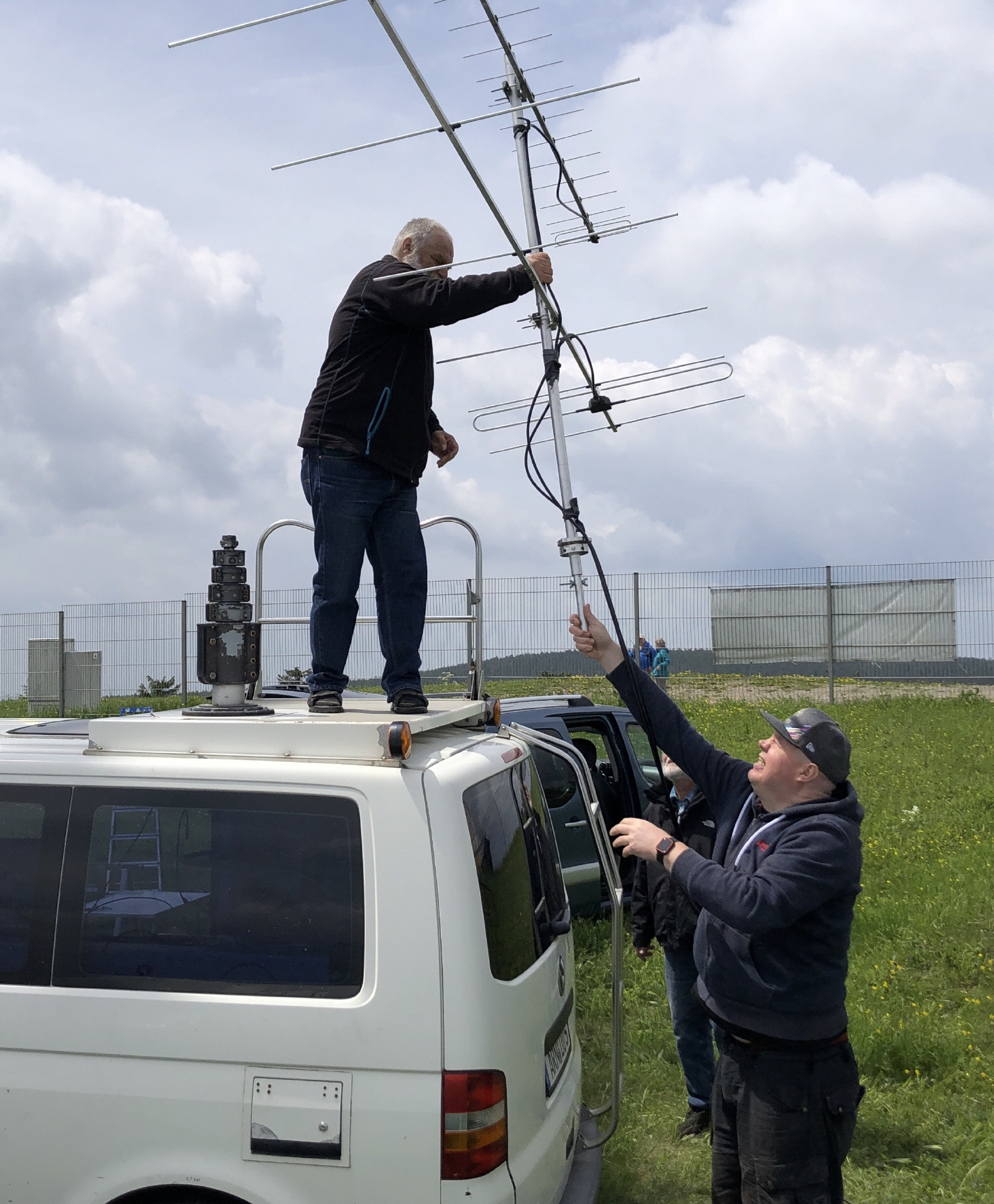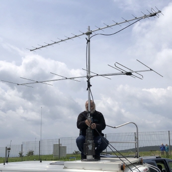Aus wirtschaftlichen- und organisatorischen Gründen, hatten wir auch in diesem Jahr die Jahreshauptversammlung des Fördervereins Schneekopfrelais DB0THA auf diesen Tag gelegt. Diese Veranstaltung hatte der Vorsitzende des Fördervereins, Rainer DO2HRB, auf 11:00 Uhr festgelegt. Da ein Teil unserer OV-Mitglieder auch im Förderverein organisiert sind, konnten wir damit gleich „zwei Fliegen mit einer Klappe“ schlagen. Es gab im Anschluss nach dieser Versammlung noch genügend Zeit zum Aufbau der Contest – Technik. Harald DD5DD, Jens DL4JE, Enrico DO6NI, Dieter DL1AWB bereiteten die Contest – Technik vor. Auch die 2m- und 70cm Yagi Antennen waren zügig an den ausfahrbaren Mast des einstigen Funkmesswagen montiert.